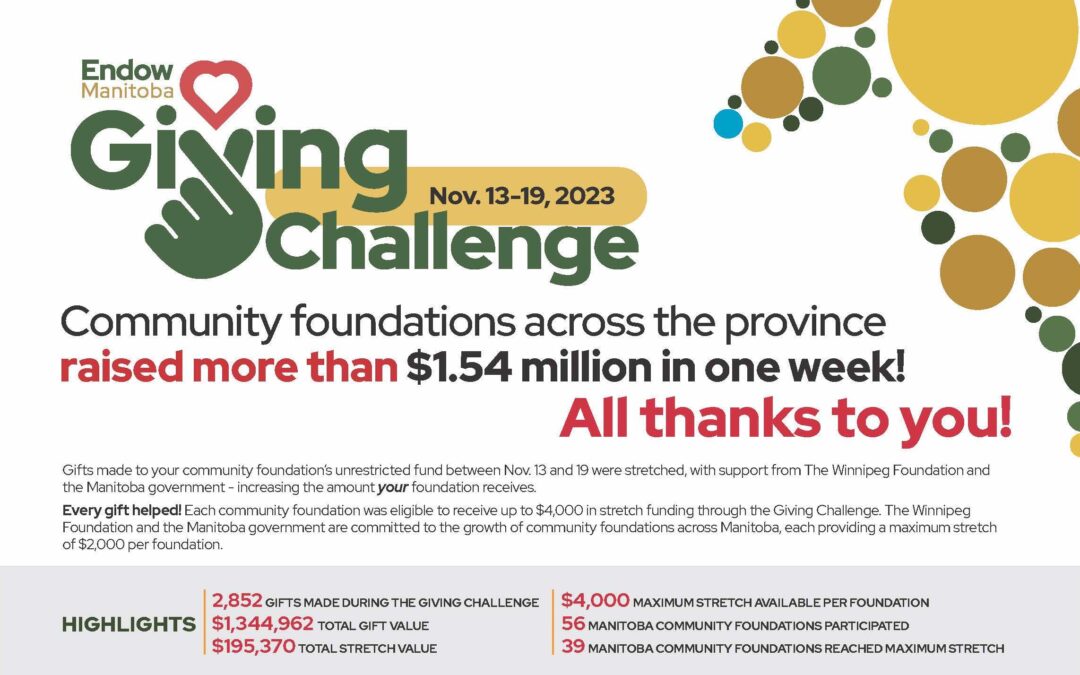 The 2023 Endow Manitoba Giving Challenge in November was a great success for the Winkler Community Foundation. Thanks to the generous community support, we raised $98,242 for the Community Fund (with additional gifts received for other funds not included in the stretching opportunity). Gifts made to the Winkler Community Foundation are pooled and permanently invested, and interest earned is granted to local initiatives each year. Since the capital is never spent, your gifts support the community forever.